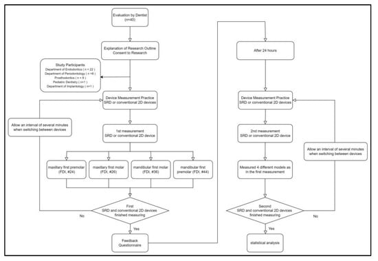 The group of 40 randomly selected subjects consisted of 32 males and 8 females. For each subject, the mean root canal length measurements and corresponding measurement times were calculated for four different tooth types using SRD and an existing 2D viewer. The normality of the continuous variables was confirmed using the Kolmogorov–Smirnov test. Table 2 shows the measurement results and times for SRD and the existing 2D device for each tooth type. The average differences between the first and second measurements were within 0.02 mm for the four tooth types with the SRD, and within 0.03 mm with the 2D device. The tooth type with the lowest standard deviation was tooth #24 for both the SRD and the 2D device. The average differences between the first and second measurements were within 6.26 s for the SRD and 4.98 s for the 2D device. The tooth type with the lowest standard deviation was tooth #24 for both the SRD and the 2D device.