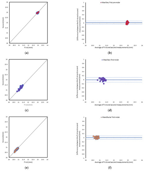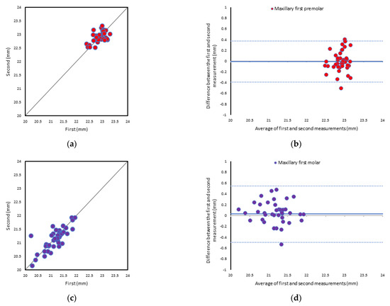 Bland–Altman plots of the first and second measurements by the spatial reality display (SRD). Scatterplot of Bland–Altman limits for maxillary first premolar as measured by the SRD (a); maxillary first premolar measurements obtained by the SRD (b); scatterplot of Bland–Altman limits for maxillary first molar as measured by the SRD (c); maxillary first molar measurements obtained by the SRD (d); scatterplot of Bland–Altman limits for mandibular first premolar as measured by the SRD (e); mandibular first premolar measurements obtained by the SRD (f); scatterplot of Bland–Altman limits for mandibular first premolar as measured by the SRD (g); and mandibular first premolar measurements obtained by the SRD (h).