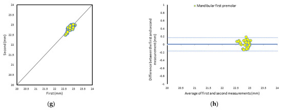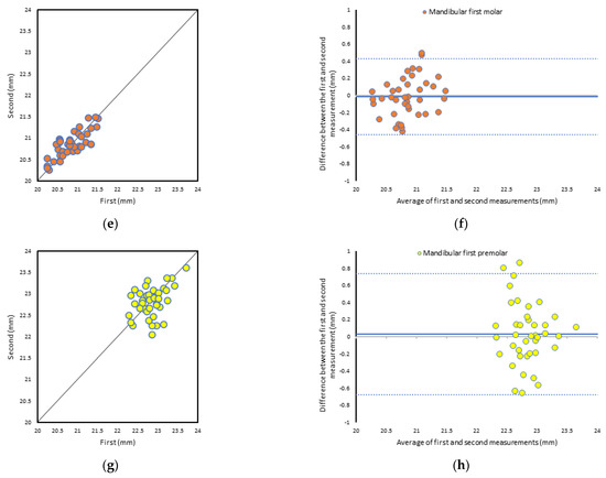 Bland–Altman plots of the first and second measurements by the two-dimensional (2D) device. Scatterplot of Bland–Altman limits for maxillary first premolar as measured by the 2D device (a); maxillary first premolar measurements obtained by the 2D device (b); scatterplot of Bland–Altman limits for maxillary first molar as measured by the 2D device (c); maxillary first molar measurements obtained by the 2D device (d); scatterplot of Bland–Altman limits for mandibular first premolar as measured by the SRD (e); mandibular first premolar measurements obtained by the 2D device (f); scatterplot of Bland–Altman limits for mandibular first premolar as measured by the 2D device (g); and mandibular first premolar measurements obtained by the 2D device (h).