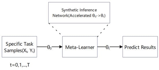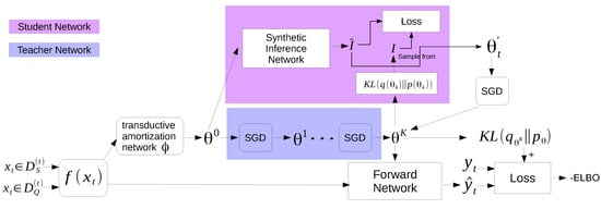 In addition to improving predictive accuracy for general tasks, it is also important for meta-models to provide good uncertainty predictions with a fast training process. Thus, we adopt the Bayesian method as a principled framework to provide uncertainty prediction. Approximate Bayesian methods are widely used to provide uncertainty prediction for deep learning models [8,9]. Bayesian meta-learning methods output a posterior distribution that correctly indicates the confidence level for unseen samples [2]. Researchers formulate the notion of the hierarchical Bayes (HB) model or empirical Bayes (EB) model, with the EB model restricting the learning of meta-parameters to point estimates. In our work, we consider EB model variational inference for meta-learning to simplify the training process without the HB formulation strength. This work focuses on the efficient usage of amortized variational inference for the Bayesian model with fast training steps. As such, we propose a synthetic inference network (SIN) combined with transduction for meta-learning, where the synthetic network produces the learned latent features over the neural network. During the training process, SIN refines the output of the transductive network that accelerates network convergence. We also propose a teacher–student network structure for the online training of SIN, where the conventional SGD-optimized network is treated as the teacher network. If not specified, we will denote the regular network optimized by SGD as the SGD network in the contents hereafter. The proposed method can converge a few steps after knowing the overall direction of the gradient descent. As illustrated in Figure 1, with collaborative training through the teacher–student network, the meta-training process is accelerated and the latent weights are optimized. Moreover, our method combines the generalization and scalability of the meta-learning model with uncertainty quantification, and it is robust to unseen datasets, owing to its posterior inference optimization. Our contributions are summarized as follows: (i) We propose a novel meta-learning model that utilizes a transductive amortization network to reduce the computational costs by optimizing the task-specific and global variables; (ii) the proposed synthetic inference network refines the output from the transductive network, significantly reducing the necessary training epochs compared with state-of-the-art methods; (iii) our method achieves quantitatively competitive performance on the Mini-ImageNet and Omniglot datasets, and superior visual performance on the ShapeNet dataset.