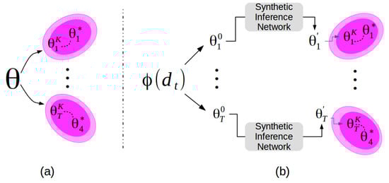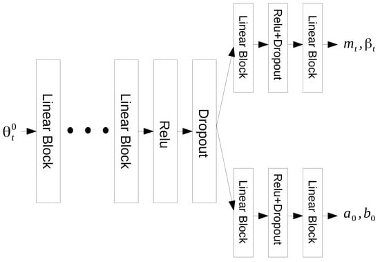 where parameter sets are trained parameters for , and . In this case, since the dimensions of these trainable parameters are low, it is unnecessary to use VI to inference the refined parameters in SIN. Instead, we use a simple encoder–decoder network that takes as the input and outputs directly since few parameters with low dimensions are easy to converge. The objective log-likelihood function for optimization is given in Equation (16):