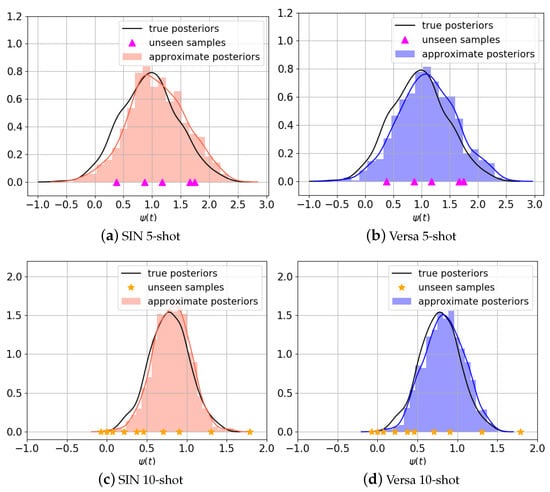 For implementation details, we generate tasks with 5 shots and 10 shots for training observations. The teacher network (SGD) and the student network (SIN) are both trained to convergence by using the Adam [28] optimizer, and the generated data samples are rearranged as mini-batches of tasks for training input. To generate this dataset, we use N random variables for and to generate the support set (small training samples) and query set (unseen samples of and ). After the loss function is converged, is inferred by SIN with the learned amortization parameters. Figure 6 shows the approximate posterior distributions inferred from unseen test samples and the true posteriors for two-shot cases. We compare the output of SIN with Versa [7], where Versa uses an end-to-end stochastic training that optimizes the likelihood function corresponding with and . We can see that SIN can output the approximate posterior that closely resembles its true posterior, and its inference results are close to the standard amortization network.