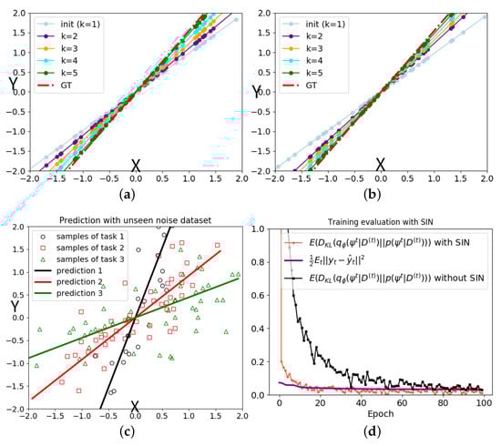 Figure 7c shows the performance of SIN for the unseen test dataset with extra noise points. In this case, we set , where denotes Gaussian white noise. The test data are generated from with noise components. We find that the proposed method can predict the regression line clearly given the unseen samples under the task of zero-shot learning. Figure 7d displays the value of the loss function and KL divergence of and during the training process, which indicates that SIN is able to accelerate the training convergence process and identify the descent direction after meta-learning.