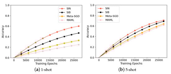 Accuracy performances for unseen samples among state-of-the-art meta-learning methods, with the increasing number of training epochs on the Mini-ImageNet dataset (image classification tasks). (a) One-shot learning. (b) Five-shot learning.