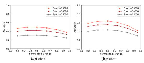 Sensitivity analysis on the accuracy factor of hyperparameter in Algorithm 1 based on the Mini-ImageNet dataset (image classification tasks); (a) one-shot learning; (b) five-shot learning.