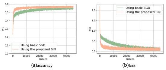 The comparison between the proposed model and the baseline (SGD) on the MINI-ImageNet dataset. Purely running the baseline network results in a slower convergence speed and worse accuracy performance at the same epochs, compared with the combined model using SIN.