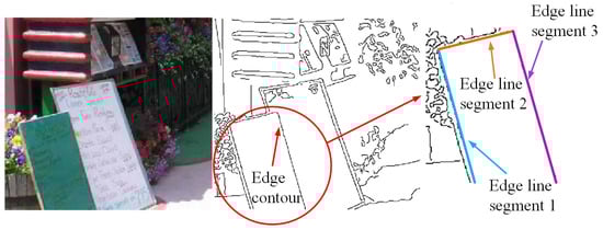 Step 1: The Canny operator [22] is used to detect the edge features in the input image, and the Moore-Neighbor algorithm [23] is used to find the edge contours. The edge contours whose length is smaller than of the image size are removed. Suppose M edge contours are extracted by the above steps (noted as the set ), where is any one edge contour.