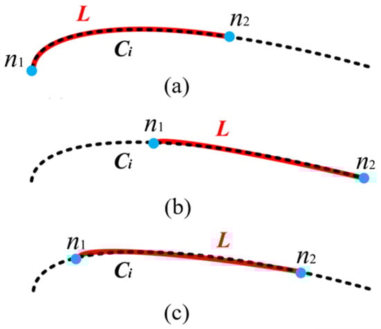 The function ceil(•) represents rounding up to the nearest integer. Therefore, as long as the number of iterations K is greater than the value in Equation (12), it is possible to reliably search for L in . Furthermore, we define to store the continuous and longest edge segments. This means that the sequence L obtained from in Step 3 is added to the collection as an edge segment. After K iterations, if no L is found, remains empty, indicating that there are no satisfying edge segments in .