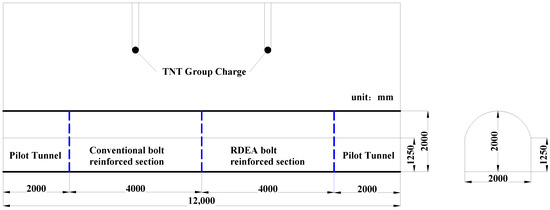 At the same time, many scholars have conducted a large number of comparative and systematic studies on such projects from various levels, such as model tests, numerical simulations, theoretical analyses, and field tests, in terms of blast resistance of caverns. The research results have also been widely applied to field engineering. Some scholars have actively explored the blast resistance of anchoring and shotcrete-supported caverns [1,2,3,4,5,6,7,8,9,10,11,12,13,14,15,16,17,18,19]: Singh [1] studied the problem of blasting damage to underground mine caverns and discussed the main factors leading to cracks and peeling of the surrounding rock of caverns and proposed that the vibration amplitude of the surrounding rock caused by blasting is an important reference. By using UDEC software, Hagedorn [2] studied and analyzed the stability of anchor-spray-supported caverns after two successive impulsive loads. Nan et al. [3] used the high-pressure plane charge loading test technique to study the blast resistance of different types of structures in the rock medium, focusing on the direct wall arch structure. Three types of structures were tested: high-performance reinforced concrete, C30 reinforced concrete, and C30 reinforced concrete with foam concrete backfill. The dynamic response and damage characteristics of these structures were investigated. The experimental results showed that, under the same plane charge explosive load, using high-performance reinforced concrete and C30 reinforced concrete with foam concrete backfill can effectively reduce the damage extent of the rock structure. The composite structure with C30 reinforced concrete and foam concrete backfill exhibited excellent blast resistance.