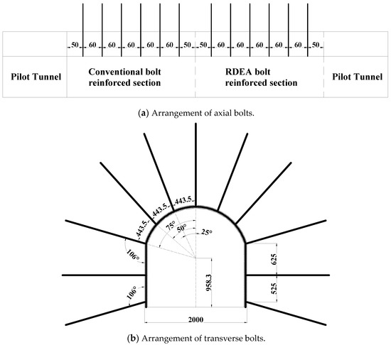 The arrangement of conventional steel-reinforced bolts and RDEA bolts was the same, with an axial distance of 0.6 m between bolts, and 50 cm left beforehand for each test section. There were 6 cross-sections arranged, with 11 bolts arranged in each cross-section. Only RDEA bolts were used in the arch part of the RDEA-bolt-reinforced section, while conventional steel-reinforced bolts were still used for the sidewall part. Specifically, one cross-section of the RDEA-bolt-reinforced section was reinforced with seven RDEA bolts and four conventional steel-reinforced bolts. The supporting surface layer was sprayed with C30 concrete with a thickness of 60 mm, and the specifications of the steel mesh were Φ6@80×80 mm. Cement slurry injection was used, and only the anchoring section of the RDEA bolt test section was injected with cement slurry. For specific anchor support parameters of the test cavern, see Figure 3.