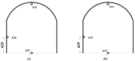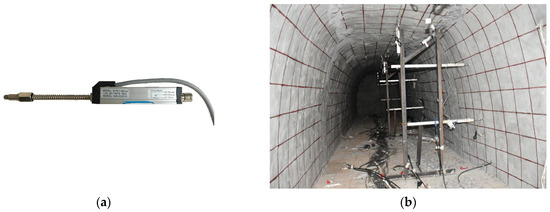 Wall displacement can reflect the macroscopic damage of the cavern under explosion loads and indicate the explosion resistance ability of different reinforcement methods. The KD2009T displacement sensor from Donghua was used in this test. The displacement sensors were mainly installed at the center of the arch crown, half arch waist, arch foot, and sidewall, measuring the relative displacement between different wall positions and the bottom plate as shown in Figure 5. The maximum range of the displacement sensor at the arch crown and half arch waist positions is ±100 mm, and the range of the sensor is ±50 mm. The displacement sensors were installed on the center cross-section of the test section to study the deformation of the wall under explosive dynamic loads and the distribution of vertical damage in the cavern. The layout of the displacement sensors is shown in Figure 6.