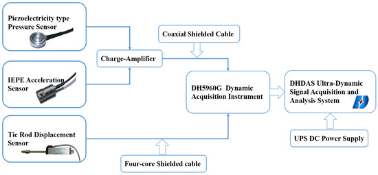 In this test, measurements were taken for explosive loads, wall displacement, and acceleration acting on the support structure. The macroscopic deformation and damage of each test section were also recorded in detail during the test. The measurement system mainly consisted of various types of sensors (including 6 pressure sensors, 8 displacement sensors, and 6 acceleration sensors), shielded cables (pressure and acceleration sensors are connected to the instrument through coaxial shielded cables, and displacement sensors are connected to the instrument through four-core shielded cables), charge amplifiers, DH5960G dynamic acquisition instrument and DHDAS ultra-dynamic signal acquisition and analysis system, and a measuring computer. During the test, UPS DC power was used to supply power to each acquisition equipment to avoid signal interference caused by unstable AC current. The schematic diagram of the measurement system is shown in Figure 10.