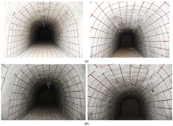 As shown in Figure 12a, after the third condition (W = 10 kg) test, the conventional steel-bolt-reinforced test section suffered serious damage, with the sprayed layer in the range from the arch crown to 1/2 arch waist deforming significantly vertically downward. There was serious delamination and shear failure on both sides of the 1/2 arch waist position, with large areas of the sprayed layer peeling off, exposing the mesh reinforcement and showing serious deformation and bending. The maximum length of the damaged area was measured to be 3.2 m, and the maximum width was 50 cm. As shown in Figure 12b, the degree of damage to the RDEA-bolt-reinforced test section was far less than that of the conventional steel-bolt-reinforced test section, with only mild delamination failure and shear cracks appearing at the 1/2 arch waist position.