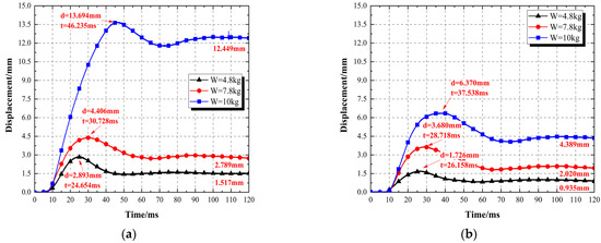 Comparison diagram of the displacement of each test section under different explosive loads at the arch crown: (a) conventional steel-bolt-reinforced test section and (b) RDEA-bolt-reinforced test section.