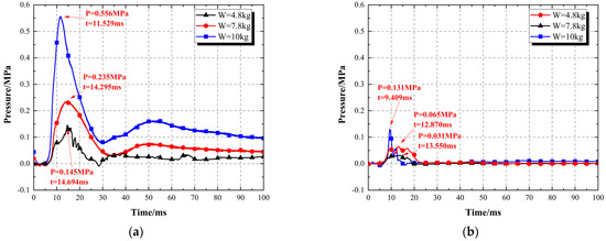 Comparison diagram of 1/2 arch waist pressure in different test sections under different explosion loads: (a) conventional steel-bolt-reinforced test section and (b) RDEA-bolt-reinforced test section.