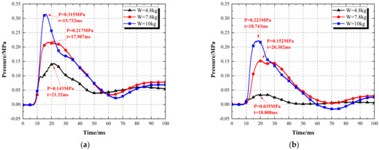 The explosive pressure can reflect the explosive load acting on the anchored cavern soil medium. In this field test, three pressure sensors were installed at different positions of each test section, and the normal direction of each pressure sensor’s pressure-bearing surface is vertical, so the pressure measured is all in the vertical direction. This article focuses on the comparative analysis of the pressure measurement data of the crown, 1/2 arch waist, and arch foot positions. The vertical pressure comparison of these positions under different conditions is shown in Figure 14, Figure 15 and Figure 16.