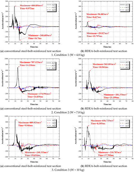 The maximum acceleration of both test sections was located at the arch crown position, with the minimum acceleration at the bottom plate position. However, the conventional steel-bolt-reinforced test section exhibited a relatively larger acceleration at both the arch crown and bottom plate positions, indicating that the full-length bonding bolt is not as effective as the RDEA bolt in reducing the acceleration of the arch crown and the bottom plate in the test section.
