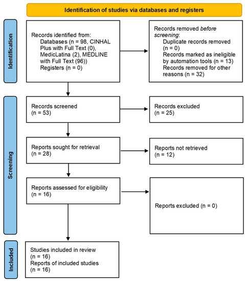 The search conducted in the databases mentioned above resulted in 98 articles. After eliminating 45 articles, of which 13 were considered duplicates and 32 did not meet the inclusion criteria, 53 articles were screened, from which the respective titles and abstracts were extracted for analysis. After reading their titles/abstracts, 25 articles were eliminated since they did not fit the study’s subject. Then, 28 articles were sought for retrieval and selected for full-text analysis, with 12 being unable to be retrieved, preventing the full reading of the text. Finally, 16 articles were included in the present integrative review. The flow chart representing the research pathway is shown in Figure 1, using the PRISMA flow diagram [24].