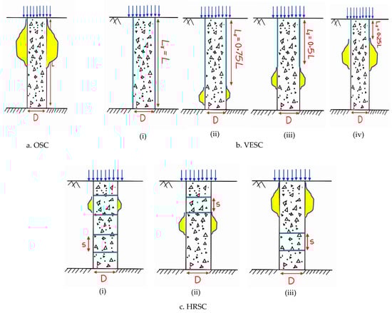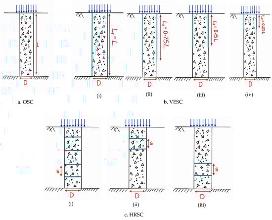 Schematic of (a) OSC, (b) VESCs with various Lr, (c)HRSCs with various geosynthetic arrangements.