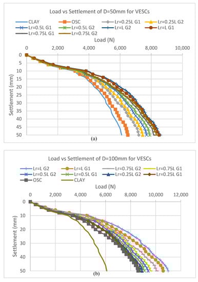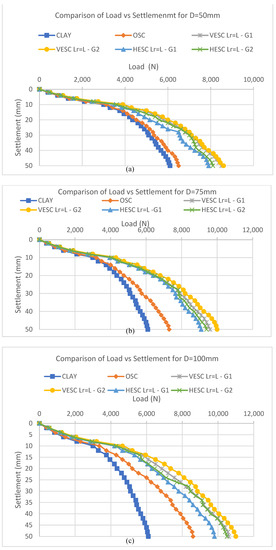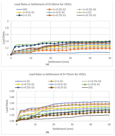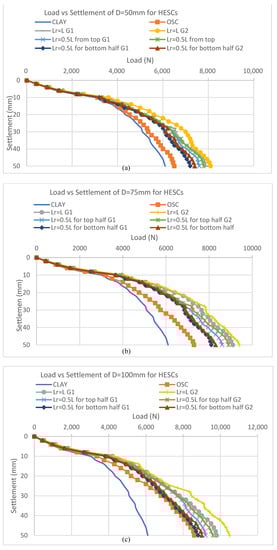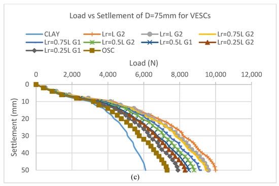 Load-Settlement variation of VESC for various Lr on single stone column with diameters (a) 50 mm, (b) 75 mm, and (c) 100 mm.