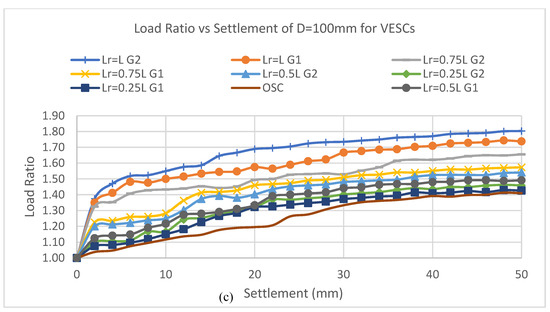 Load Ratio-Settlement variation of VESC for various Lr on single stone column with diameters (a) 50 mm, (b) 75 mm, and (c) 100 mm.