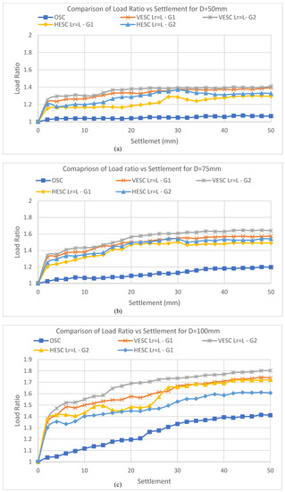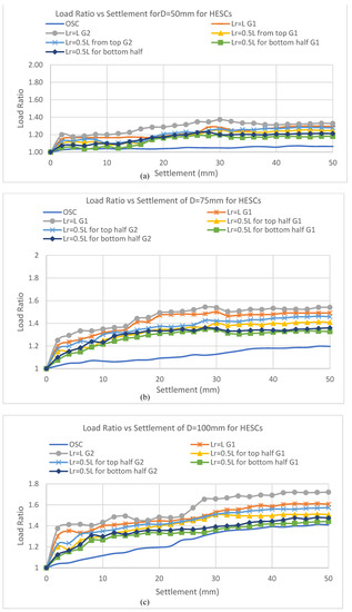 Comparison of Load Ratio-Settlement behaviour between VESC and HRSC for Lr = L on single stone column with diameters (a) 50 mm, (b) 75 mm, and (c) 100 mm.