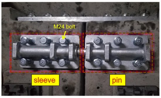 The new line comprises a 3.6 m prefabricated steel-spring floating-slab track with a WJ-2 fastener and uses a double-TMSH layout, as shown in Figure 2. Two pairs of shear hinges are symmetrically positioned on the inner and outer sides of the rail. In Figure 2, it can be seen that the shear hinge of line 15 is composed of a sleeve, a shear rod, and M24 bolts. According to field research, TMSHs have various shapes, but the working principle is always the same, so the effect of the shape of the TMSH on its performance is not considered in this study.