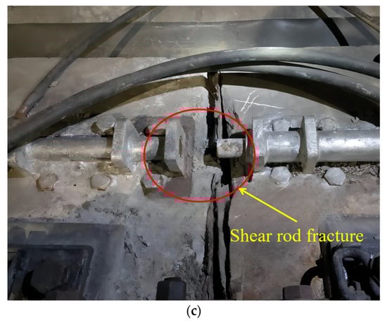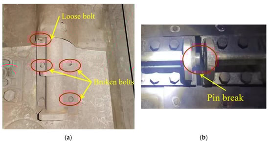 Through field research to examine the old and new lines, respectively, we found that the TMSH-to-SMSH ratio was 3:1, and SMSHs did not incur damage. In the TMSHs, we found bolt loosening, broken bolts (Figure 3), pin or shear-rod fracture (Figure 4 and Figure 5), and other types of damage, as shown in Table 1.