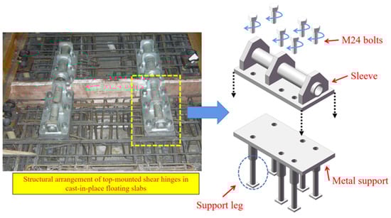 To fully understand the status and performance of the shear hinge in actual operation, field research was conducted on an old subway line that had been in operation for 13 years and on a new line that had been in operation for 2 years, with speeds of 70–80 km/h. It is known that there are three different types of shear hinges: the top-mounted shear hinge (TMSH), side-mounted shear hinge (SMSH), and built-in shear hinge (BISH). The types of shear hinges used on the old line and the new line are the TMSH and SMSH. The old line comprises a 4.8 m prefabricated steel-spring floating-slab track, with DTIII2-type fasteners used to fix the rail. The shear-hinge layout combines a TMSH and an SMSH, as shown in Figure 1. The TMSH is pinned into a sleeve, and an M24 bolt fixes it to the adjacent two floating slabs, symmetrically along the track centerline, positioned on the outer side of the rail.