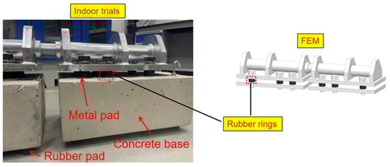 where  is the longitudinal modulus of elasticity of rubber under pure compression,  is the bulk modulus of elasticity of rubber,  is the rubber hardness correction factor (the specific values are given in []), and  is the primary shape factor (= D/4). After measurement, the total weight of the TMSH is 60.34 kg, and the parameters of the rubber pads are shown in Table 2. In order to reduce the natural frequency of the TMSH to the low-vibration region of the floating slab, the target frequency is set to 80 Hz (in Figure 17b,d of [], it is shown that the low-vibration region of the floating slab will be entered after 80 Hz), and Equations (1)–(4) are then substituted to calculate the results. Twelve ring-shaped rubber pads with an inner diameter of 24 mm, an outer diameter of 48 mm, and a thickness of 18 mm are supported through the bolts between the shear hinge and the metal pad to reduce the natural frequency of the TMSH, as shown in Figure 5.