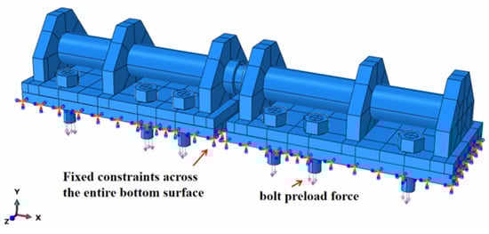 where  is the bolt preload force,  is the bolt torque,  is the diameter of the bolt (calculated using Equation (5)), and the corresponding bolt preload is 73.529 kN. The TMSH loads and constraints are shown in Figure 6.