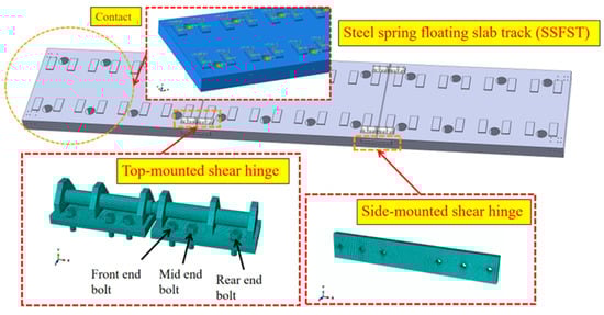 Steel-spring floating-slab tracks (SSFST) are one of the most successful types of tracks used in urban rail transportation worldwide, and their vibration-damping effect is globally recognized [,]. This is especially true in China, where urban rail transportation has developed rapidly in recent years, including subways, which are developing at a steady rate, and the new urban railroad, which is undergoing rapid development []. SSFSTs are used in large quantities and are composed of a rail, a floating slab, a steel-spring isolator, fasteners, and a shear hinge. SSFSTs are strong and discrete and therefore require the installation of shear hinges to enhance the integrity of the bed, where the shear hinges, which connect the floating slabs, restrain the vertical and lateral differential movements of the slab ends []. Damage to different elements of SSFSTs under long-term train loading can directly affect the safety and stability of the SSFST system and vehicle operation [,,,]. As a structure that connects the floating slabs, the TMSH undergoes damage, such as loose and broken bolts and broken shear rods, during its service period. This damage accelerates fatigue damage to the fasteners and steel spring at the joint of the floating slab, which indirectly affects the service performance of the floating slabs and the railway. Thus, it is important to address the problem of damage to TMSHs in SSFSTs [,,].