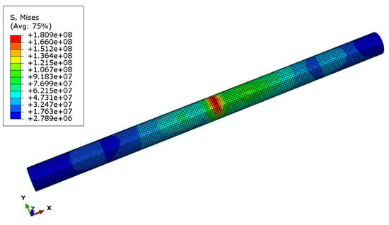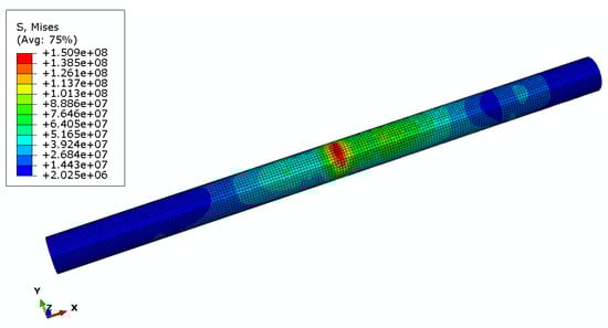 Since three floating-slab tracks are built in this validation model, only the adjacent bogie loads of two adjacent carriages are considered, and the load is applied using 1/2 fastener spacing as the step length, running uniformly and continuously along the x-axis. Figure 8 shows the stress value of the shear rod under metal-pad conditions, with a maximum strength of 180.9 MPa, and Figure 9 shows the stress values with an additional rubber-pad layer. The shear rod is subjected to a maximum Mises stress value of 150.9 MPa. From a static point of view, the rubber pad reduces the stress value of the shear rod by 16.7%.