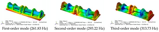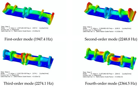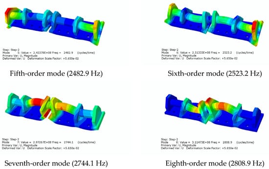According to the field research, the damage to the current shear hinge mainly consisted of a shear-rod break, bolt loosening, and broken bolts. Pre-stress application will change the structural-stiffness matrix, so to obtain the natural frequency of the shear hinge’s working conditions, a shear-hinge pre-stress assembly modal analysis was conducted. The natural frequencies are shown in Figure 10, and the vibration patterns are described in Table 5 (the displacements in the results do not have any physical meaning and are not exact displacements; they are only used to determine the direction of vibration). We used the pre-stressing modal method for nonlinear modal analysis of the shear-hinge assembly. In the second step, a modal analysis step was established using the Lanczos method to extract the 20th mode and solve the vibration equation.