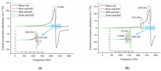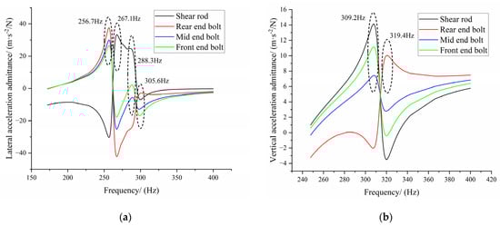 In Figure 14a, it can be seen that the sensitive peaks of transverse acceleration admittance at the connection point of the shear rod and sleeve are near the first (261.83 Hz)- and second (293.22 Hz)-order modes and the peak level is higher in the first order. In Figure 14b, it can be seen that the shear rod has only one sensitive peak under vertical excitation, which is located near the third-order (313.73 Hz) mode. The peak transverse acceleration admittance values of the front-, middle-, and rear-end bolts are located near the first-order mode (261.83 Hz) and the second-order mode (293.22 Hz), indicating that the excitation of the first two order modes will mainly produce transverse displacement. In Figure 14b, it can be seen that the resonance peaks of the bolts in the vertical direction of the three positions are all in the third-order mode (313.73 Hz), which can be summarized as follows: the first- and second-order modes mainly produce transverse acceleration, and the third-order mode mainly produces vertical acceleration.