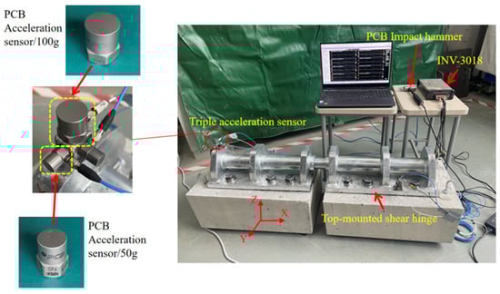 Before the test, the TMSH was fixed with M24 bolts to a concrete base supported by four rubber pads, and two–three sensors were glued to measurement points 9 and 40 and connected to the acquisition card using BNC cables. The test system was set up as shown in Figure 15.