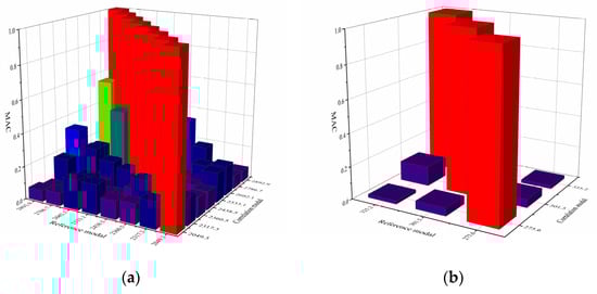 Modal confidence criterion calibration (MAC) for modal test using the hammering method: (a) TMSH on the metal pad; (b) TMSH on the rubber pad.
