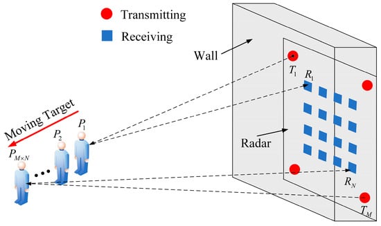 Multiple channels in the multiple-input-multiple-output (MIMO) through-wall radar (TWR) can work simultaneously to collect data quickly, which can realize real-time through-wall imaging (TWI) [1,2,3,4]. In addition, sparsely distributed transmitting and receiving antennas can form a large aperture, to obtain a high resolution. Therefore, MIMO TWR is an essential technology in the detection of through-wall targets [5,6,7].