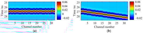 where “” represents the convolution operation, which can be used to calculate the time difference of the two signals [10]. Similarly, if the positions of channel 10 and channel 19 are the same, the positions of channel 19 and channel 28 are the same, and the positions of channel 28 and channel 1 in the next frame (represented as channel 33) are the same, then the increase rates of the delays (, , and ) of the remaining three sections can be calculated as: