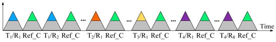 In the RCMCA-based system, the switching process of the MIMO channel and reference channel is given in Figure 4. represents the channel formed by the th transmitting antenna and the th receiving antenna, and is the reference channel. The reference channel and the MIMO channel work interleaved. The reference channel will work once after each MIMO channel completes data acquisition. The position of the reference channel remains unchanged, it can obtain the position difference of the moving target and use it in the compensation of the MIMO channel.