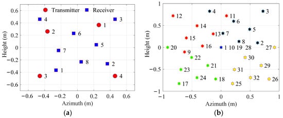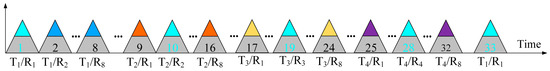 The single-frame data of the MIMO array contain 32 channels; the switching sequence of the channels is shown in Figure 7, where the blue triangles represent equivalent channels with overlapping positions. The echo time delay of moving targets measured by all channels is , which can be expressed as: