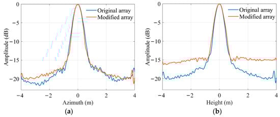 The simulation results of the resolution before and after the array improvement are shown in Figure 6. It can be seen that the resolution of the improved array is basically the same as that of the original array. The height sidelobe of the array after improvement deteriorated a little, but remained below −14 dB, which would not affect the subsequent 3D TWI.