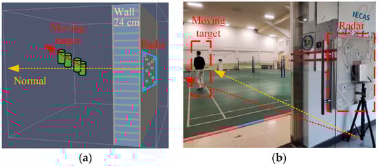 We use gprMax software (v3) to build the model of the 3D TWI for a moving target [15]. The model is given in Figure 10a, which is constructed strictly according to the real scene in Figure 10b. The thickness of the wall is 24 cm, and the relative permittivity . The radar parameters designed in the simulation are given in Table 1. The array structure of the MIMO radar is given in Figure 5b. In the simulation, the human target is equivalent to a cylinder. The target moves away from the radar at a speed of 0.8 m/s from (0, 0, 4.0 m). Based on the normal direction of the wall, the moving direction of the target is 30°.