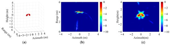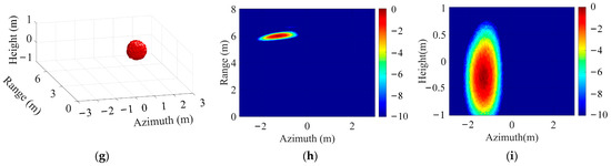 The 3D imaging, azimuth-range 2D projection, and azimuth-height 2D projection results without compensation are given in Figure 11a–c. The sidelobes in the imaging are high, and the position shows obvious deviation according to the 2D projections of the azimuth range and azimuth height. Figure 11e shows the azimuth-range 2D projection compensated by the RCMCA; the sidelobes of the target are low, and the imaging position is basically close to the starting point (0, 0, 4.0 m). Figure 11g–I are the imaging results after compensation using the algorithm proposed in this paper. The problem of the sidelobes and the position deviation of the target is also well resolved, and the effect has reached the same level as the RCMCA.