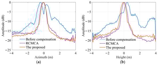 Figure 12 is the projection comparison of the 3D imaging for the different algorithms in the azimuth and height directions. The sidelobe levels in the azimuth and height directions before compensation are −1.3 dB and −6.0 dB, respectively, and the position deviation levels in the azimuth and height directions are 0.32 m and 0.30 m, respectively. The RCMCA eliminates the sidelobes in the azimuth and height directions, and the position deviations in the azimuth and height directions are 0.06 m and 0.05 m, respectively. The sidelobes in the azimuth and height directions are also basically eliminated after compensation using the proposed method, and the position deviations in the azimuth and height directions are 0.03 m and 0.08 m, respectively, which are basically consistent with the RCMCA.