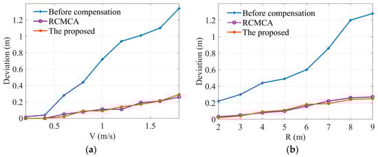 In addition, the simulations are carried out separately for the targets whose velocity is between 0 and 1.8 m/s, and whose distance is between 2 and 9 m. Setting the starting point of the target as (0, 0, 4.0 m), Figure 13a shows the positioning deviation (3D positioning deviation) of the targets at different speeds. The position deviation before the motion compensation increases with the moving speed. After the RCMCA or the proposed algorithm, the position deviation is kept within 0.30 m at different speeds. Figure 13b gives the positioning deviation when the target passes through different positions at a speed of 0.8 m/s. The positioning deviation increases with distance without compensation. After being compensated using the RCMCA or the proposed algorithm, the position deviation Is kept within 0.30 m.
