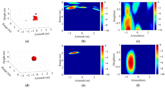 Figure 14a–i show the 3D imaging and 2D projection with no compensation, the RCMCA, and the proposed algorithm, respectively. It is obvious that the sidelobes of the imaging are high without compensation, and the position shows deviation. After compensation using the RCMCA, the sidelobes of the target are eliminated, and the position deviation is also corrected. Figure 14g–i are the imaging results after compensation using the proposed algorithm. The problems of the target sidelobes and deviation have also been well resolved, and the imaging effect is basically the same as that of the RCMCA. The target positions before motion compensation, after the RCMCA, and after the proposed algorithm are (−1.95, 6.31 m), (−1.53, 6.16 m), and (−1.52, 6.18 m), respectively. The target position compensated using the proposed method is basically consistent with the RCMCA, which is close to the initial point (−1.5, 6.0 m).