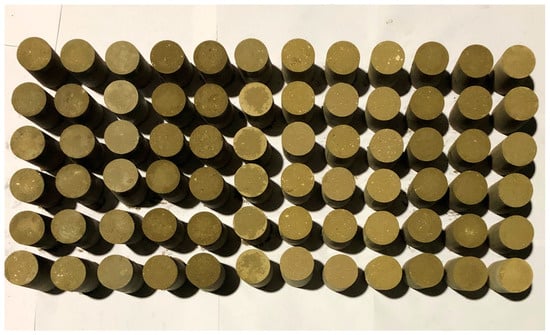The manufacture of similar materials containing solid paraffin wax requires heating, and the equipment for making the test pieces must be kept at a specific temperature before the test materials are molded and hardened. Considering that the mixed materials after uniform mixing are prone to adhesion to the mold during the pressing process of the test piece, and in order to ensure that the test piece has a smooth and complete surface after demolding, a double-cast-iron mold with evenly applied lubricating oil on the internal surface of the mold was used to make a cylindrical sample. The sample size was φ = 50 mm × 100 mm, which meets the requirements of the uniaxial compression of the specimen.