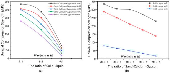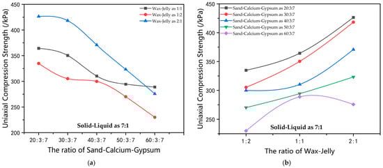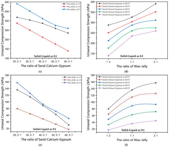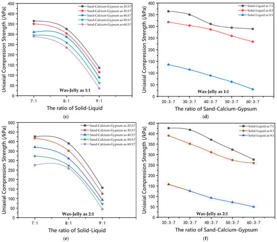The influence curve of the ratio of solid–liquid materials on the compressive strength of the material. (a) Influence curve of the ratio of river sand–calcium carbonate–gypsum on the uniaxial compression strength when the solid–liquid materials ratio is 7:1. (b) Influence curve of the ratio of paraffin wax–petroleum jelly on the uniaxial compression strength when the solid–liquid materials ratio is 7:1. (c) Influence curve of the ratio of river sand–calcium carbonate–gypsum on the uniaxial compression strength when the solid–liquid materials ratio is 8:1. (d) Influence curve of the ratio of paraffin wax–petroleum jelly on the uniaxial compression strength when the solid–liquid materials ratio is 8:1. (e) Influence curve of the ratio of river sand–calcium carbonate–gypsum on the uniaxial compression strength when the solid–liquid materials ratio is 9:1. (f) Influence curve of the ratio of paraffin wax–petroleum jelly on the uniaxial compression strength when the solid–liquid materials ratio is 9:1.