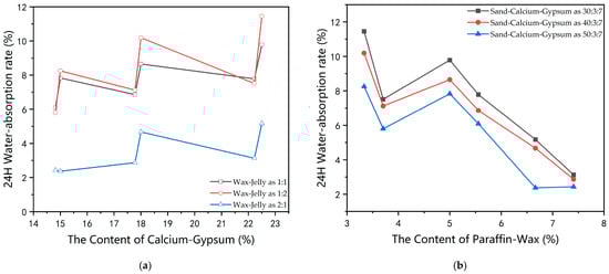 When the proportion of solid materials is fixed, the paraffin wax content of the cementing agent increases, and the 24H water absorption is mainly related to the pore volume of the standard sample. From Figure 5b, it can be seen that the effective pore volume of water absorption decreases with the increase in paraffin wax content. The mixture of molten paraffin wax and petroleum jelly was used in binding the similar aggregate materials of the water-resisting layer, and paraffin was the main sealing component of the water-absorbing pore of the sample, so the value of 24H water absorption rate decreased gradually. Therefore, in Figure 5b, with a river sand–calcium carbonate–gypsum ratio of 40:3:7, as the paraffin wax content increases from 3.33% to 7.41%, the value of 24H water absorption of the similar materials sample generally decreases from 10.19 to 2.87. Among them, when the paraffin wax content accounts for 5%, the 24H water absorption value suddenly increases to 8.65.